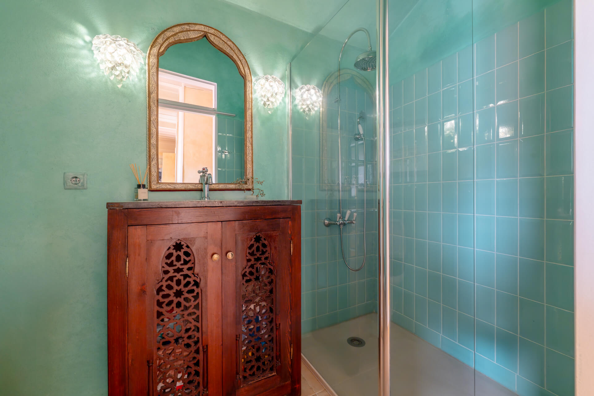 Fica equipada com: placa vitrocerâmica Teka; frigorífico e congelador LG, side by side, com dispensador de gelo; forno elétrico Teka, microondas encastrado Balay, máquina de lavar louça Teka, máquina de lavar roupa LG e termo acumulador Vulcano com142 litros.