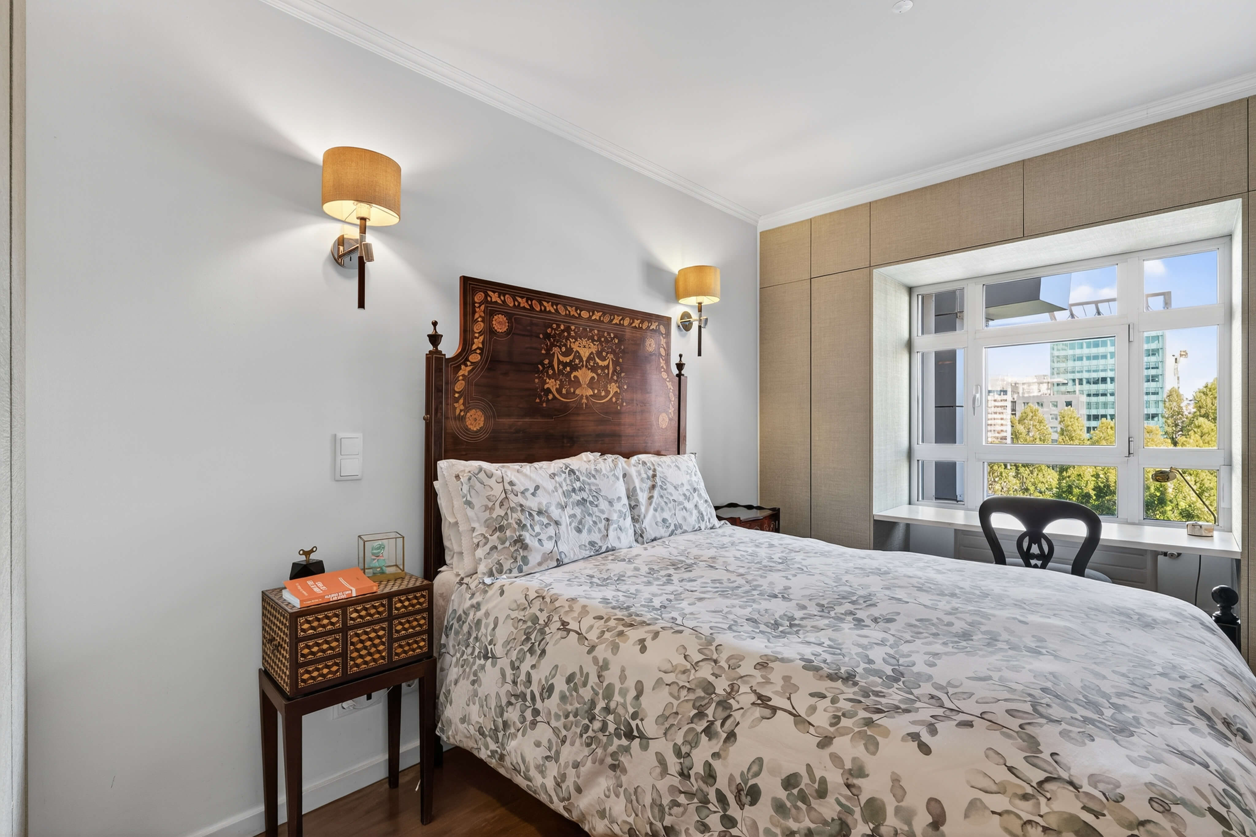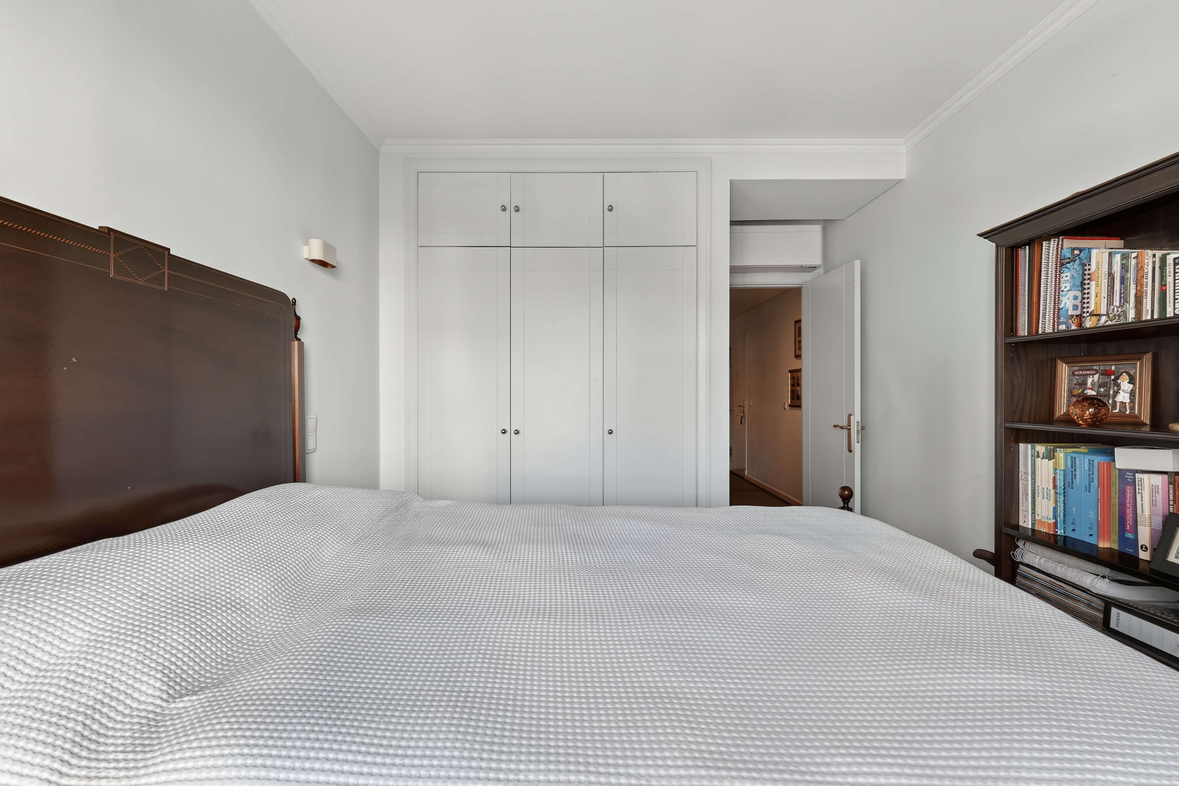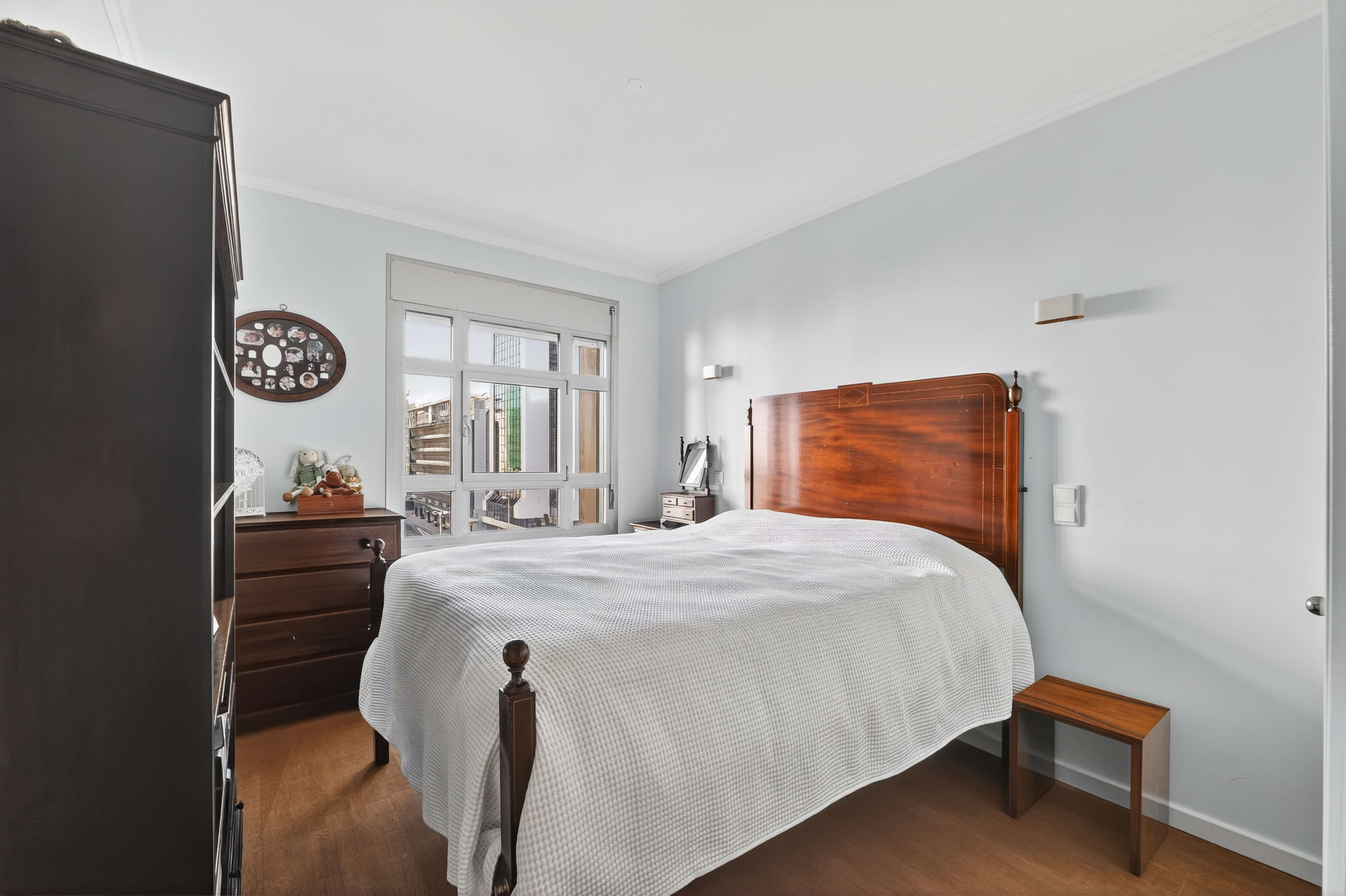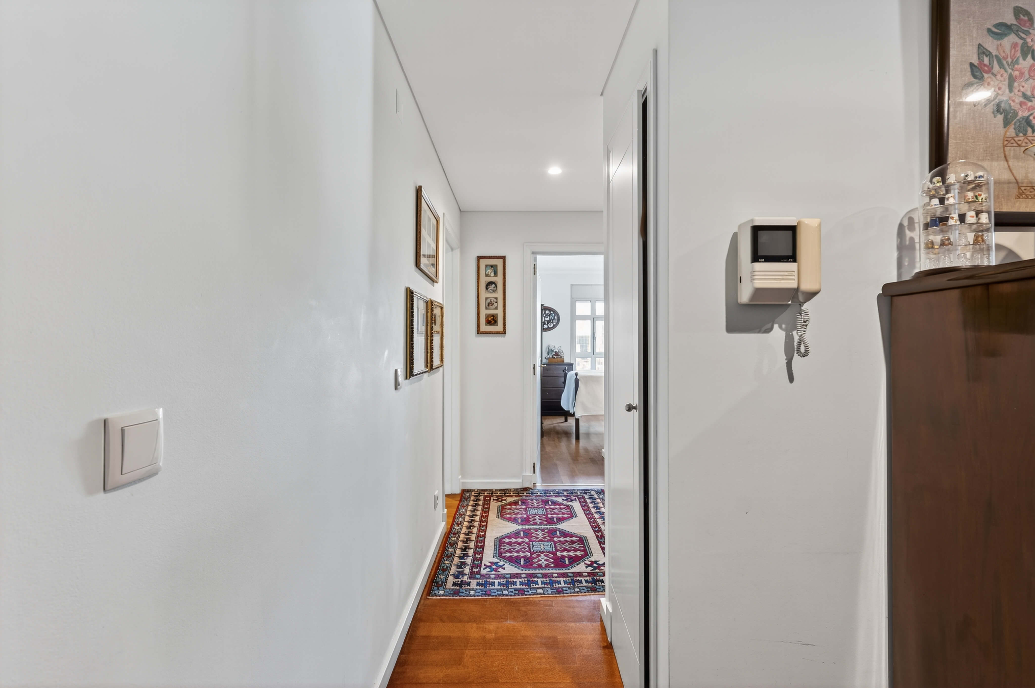 O apartamento conta ainda com 3 quartos, um deles em suíte, todos eles com roupeiros embutidos e iluminados, duas casas de banho (uma com banheira, outra com duche) e ainda uma casa de banho social.