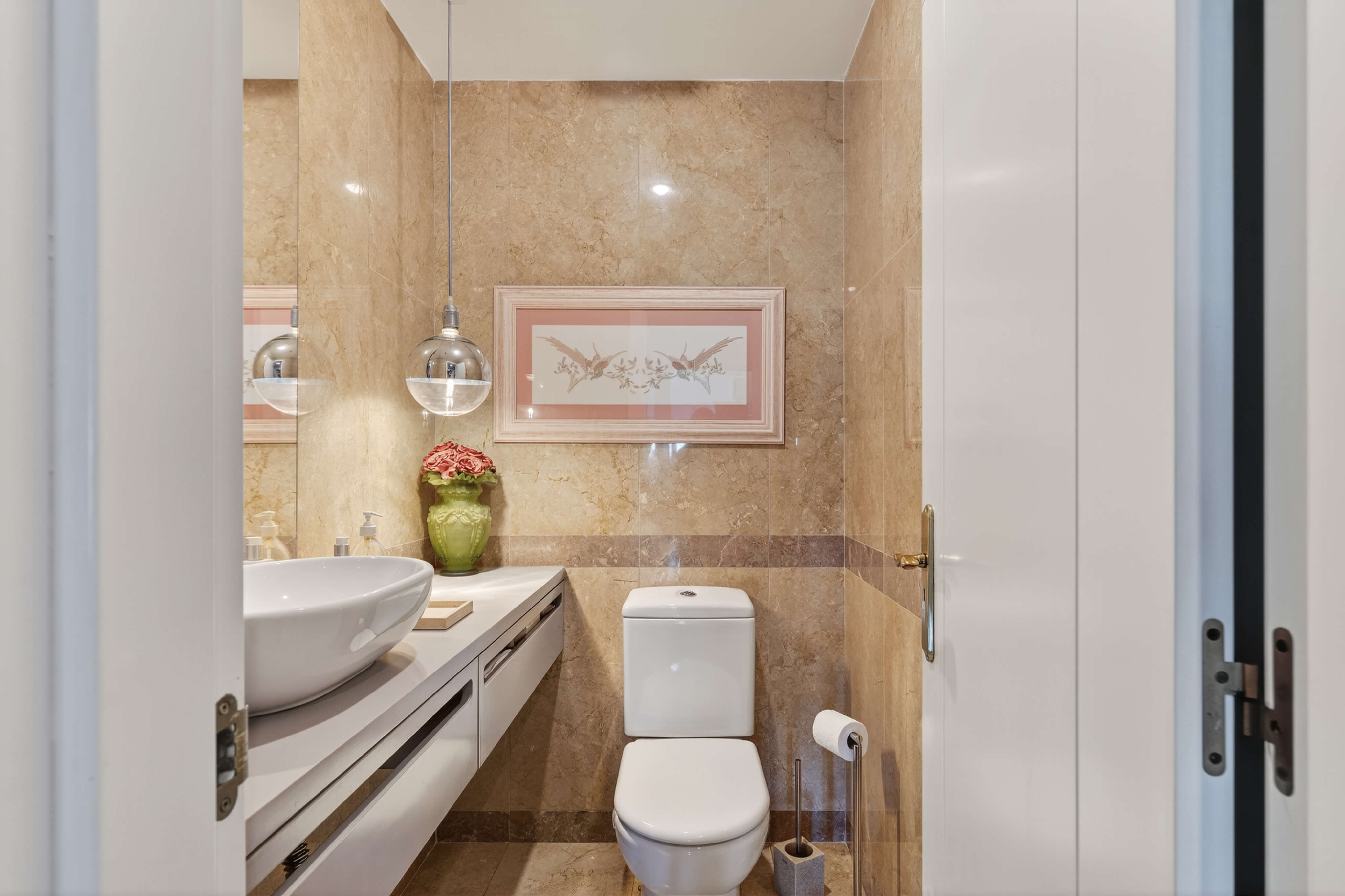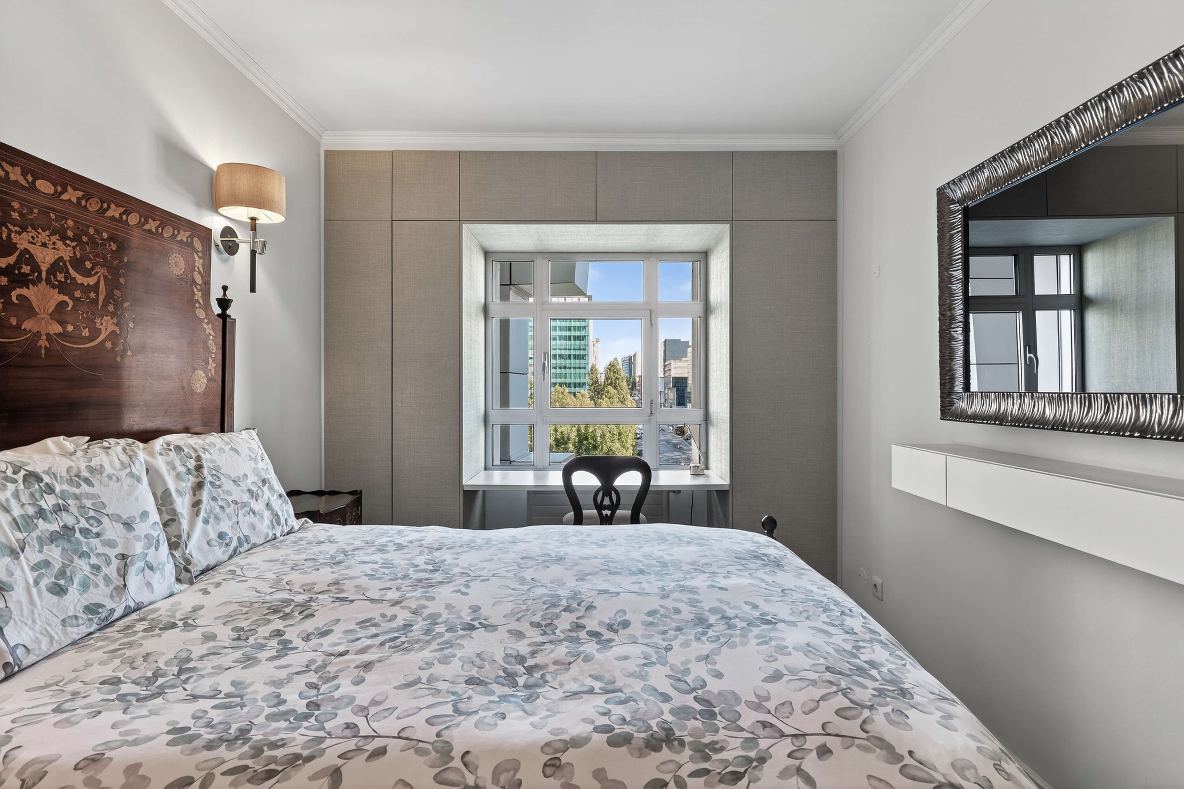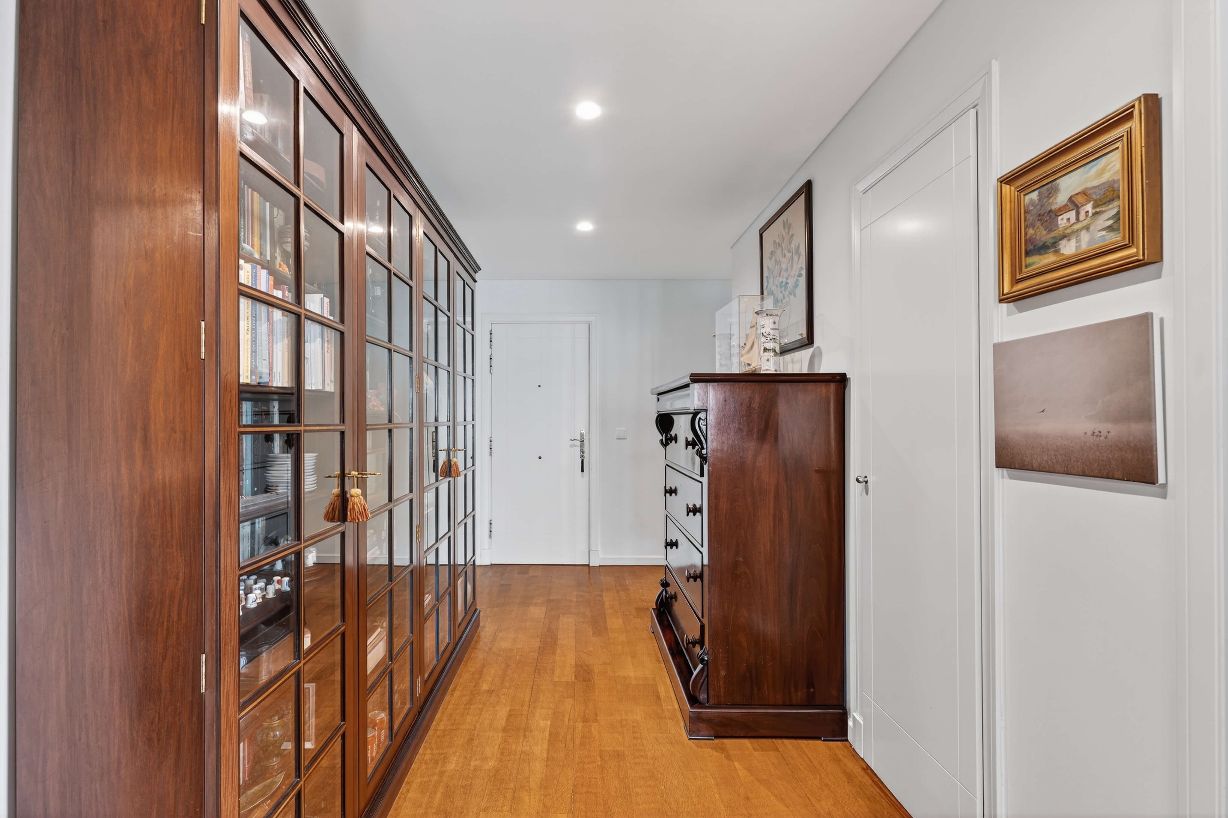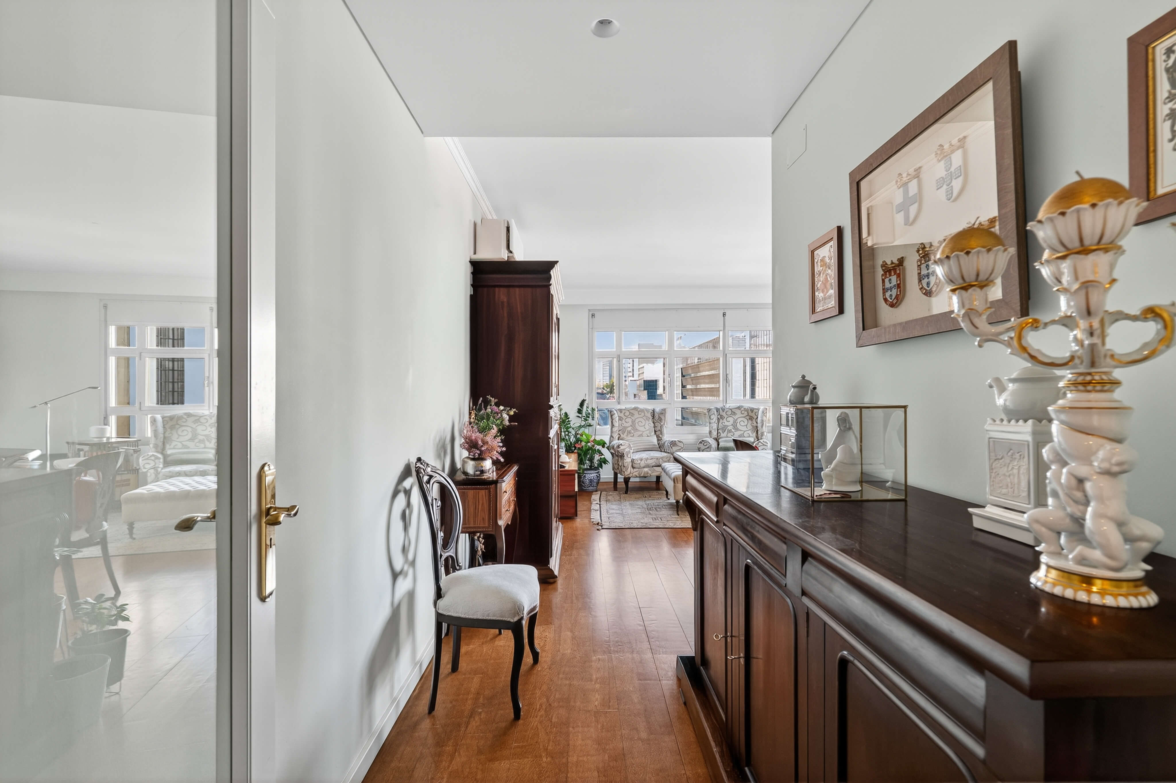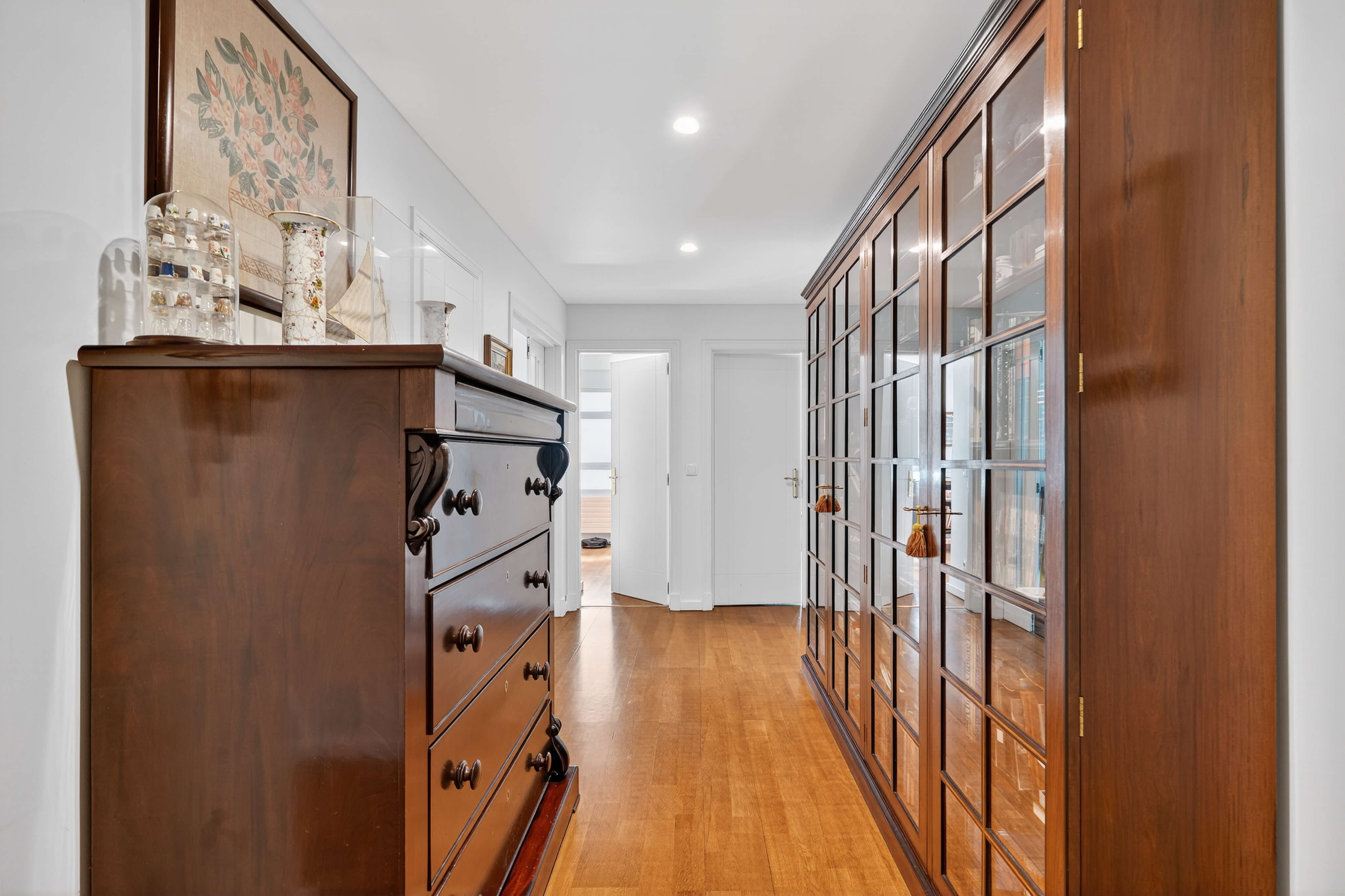 O apartamento conta ainda com 3 quartos, um deles em suíte, todos eles com roupeiros embutidos e iluminados, duas casas de banho (uma com banheira, outra com duche) e ainda uma casa de banho social.