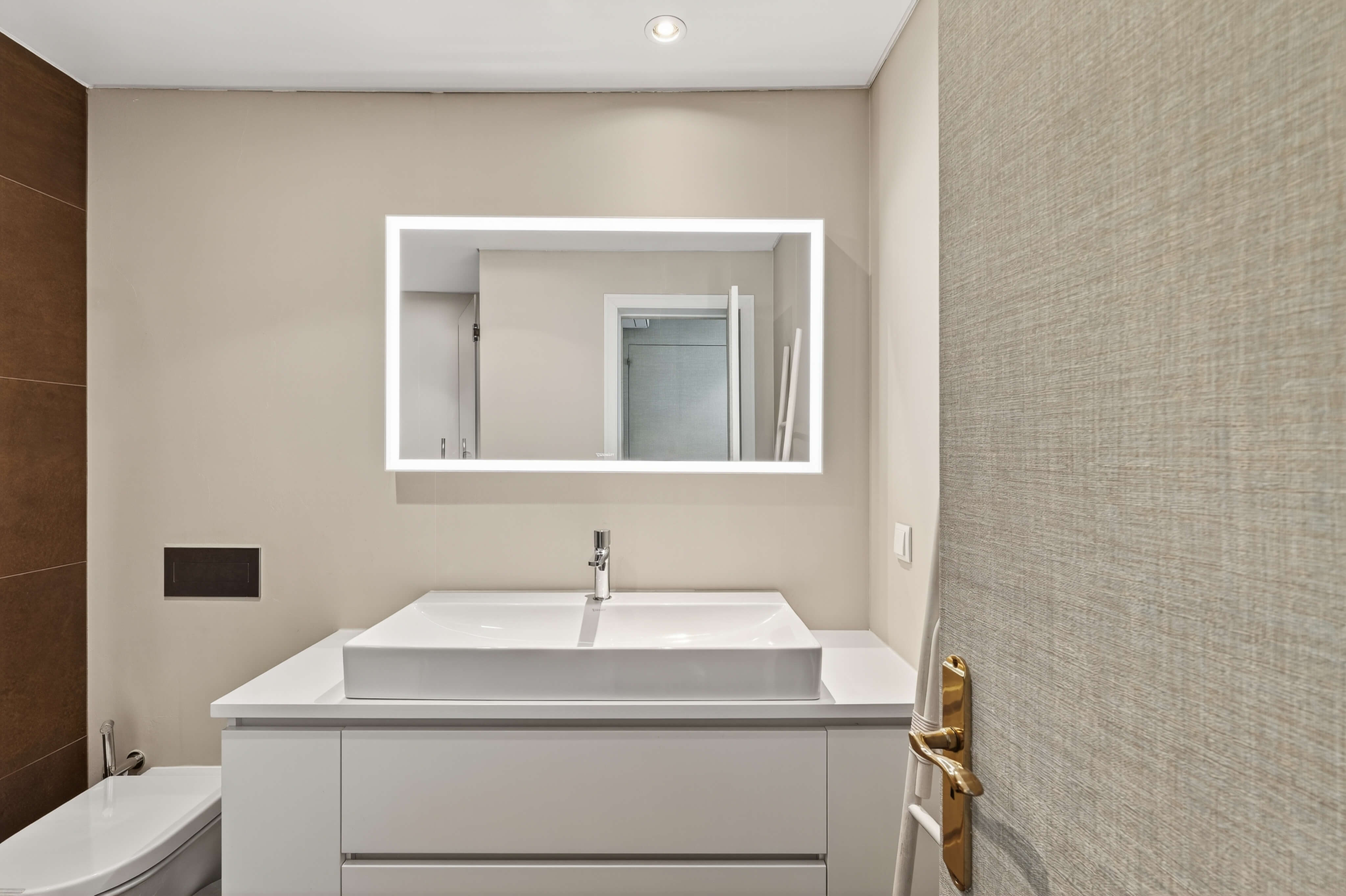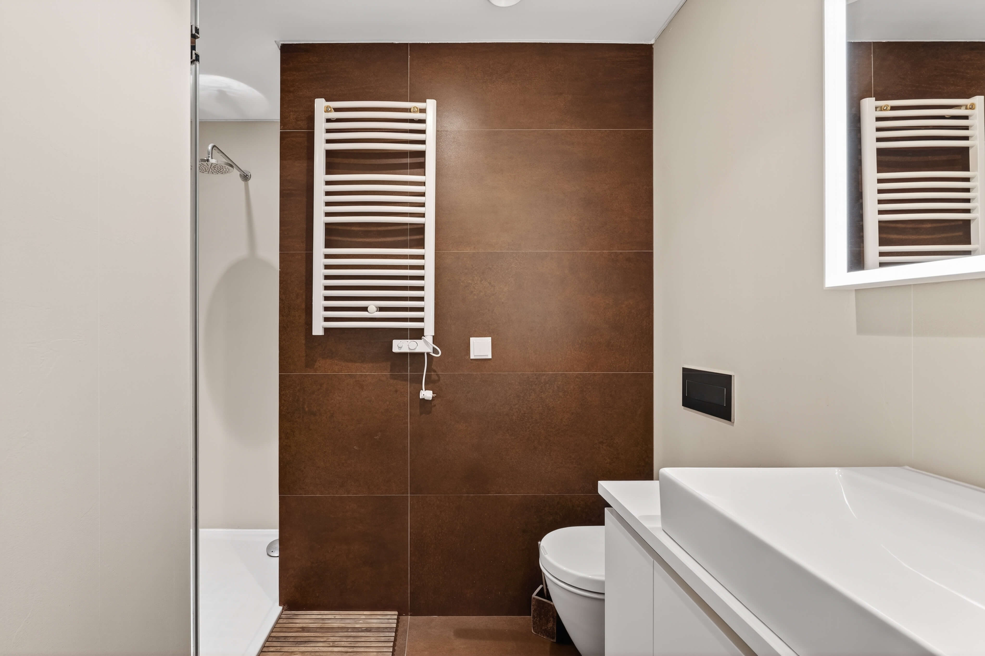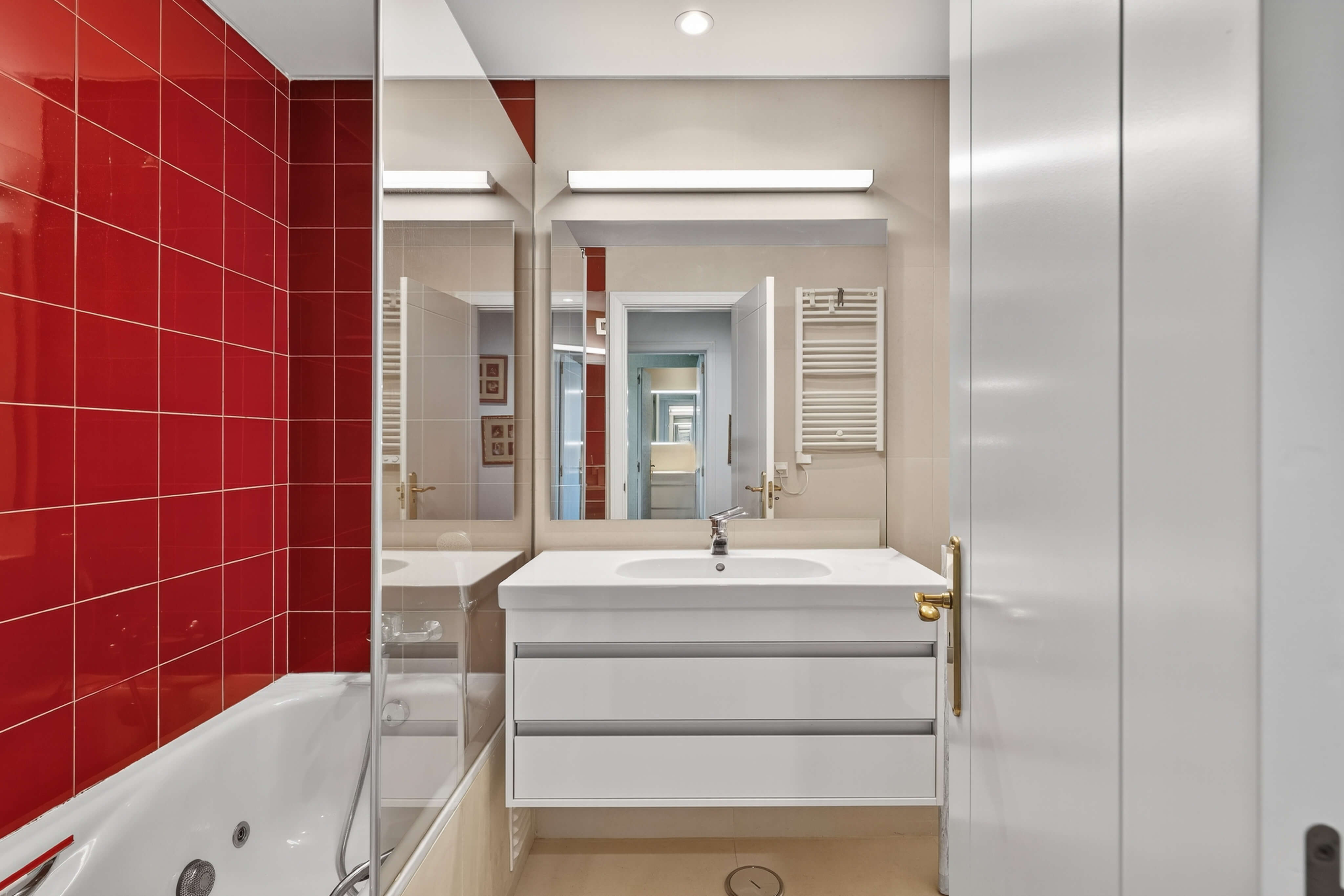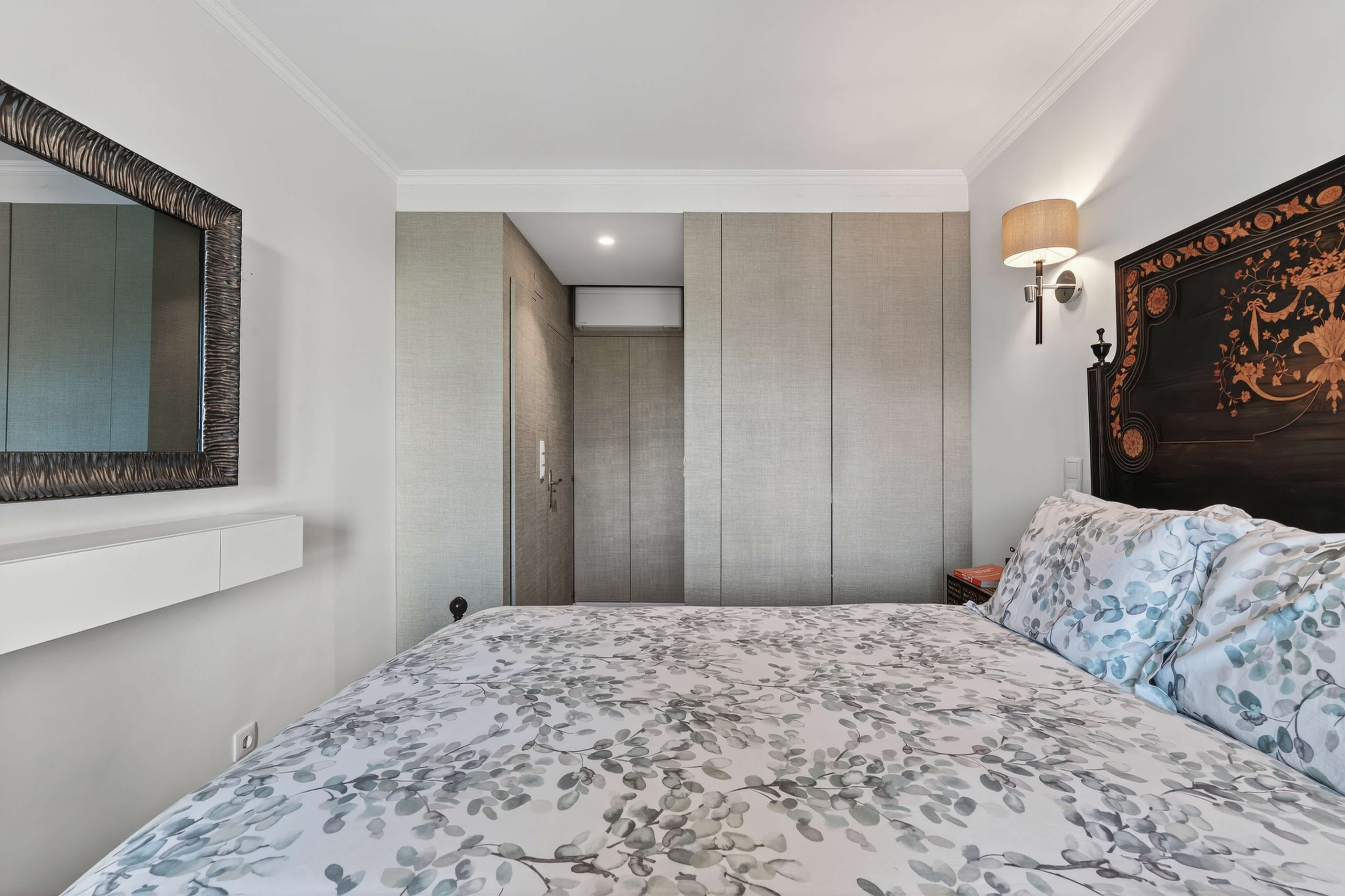 O apartamento conta ainda com 3 quartos, um deles em suíte, todos eles com roupeiros embutidos e iluminados, duas casas de banho (uma com banheira, outra com duche) e ainda uma casa de banho social.
